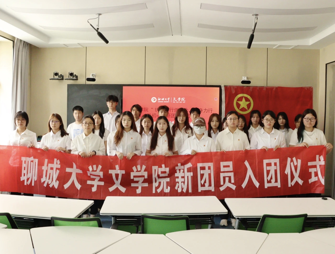 入团仪式在庄严的国歌声中正式开始,与会人员全体肃立,齐唱国歌。主持人李敏宣读新团员名单,新一批优秀青年光荣地加入中国共产主义青年团,为团组织注入了新鲜血液。石勇为新团员代表佩戴团徽。熠熠生辉的团徽,不仅是一份荣誉的象征,更是一份责任与使命的承载。随后,领誓人冯蒙雨与全体新团员面向团旗,右手握拳,庄严宣誓,表达了对共青团的无限热爱和为共产主义事业奋斗的坚定决心。