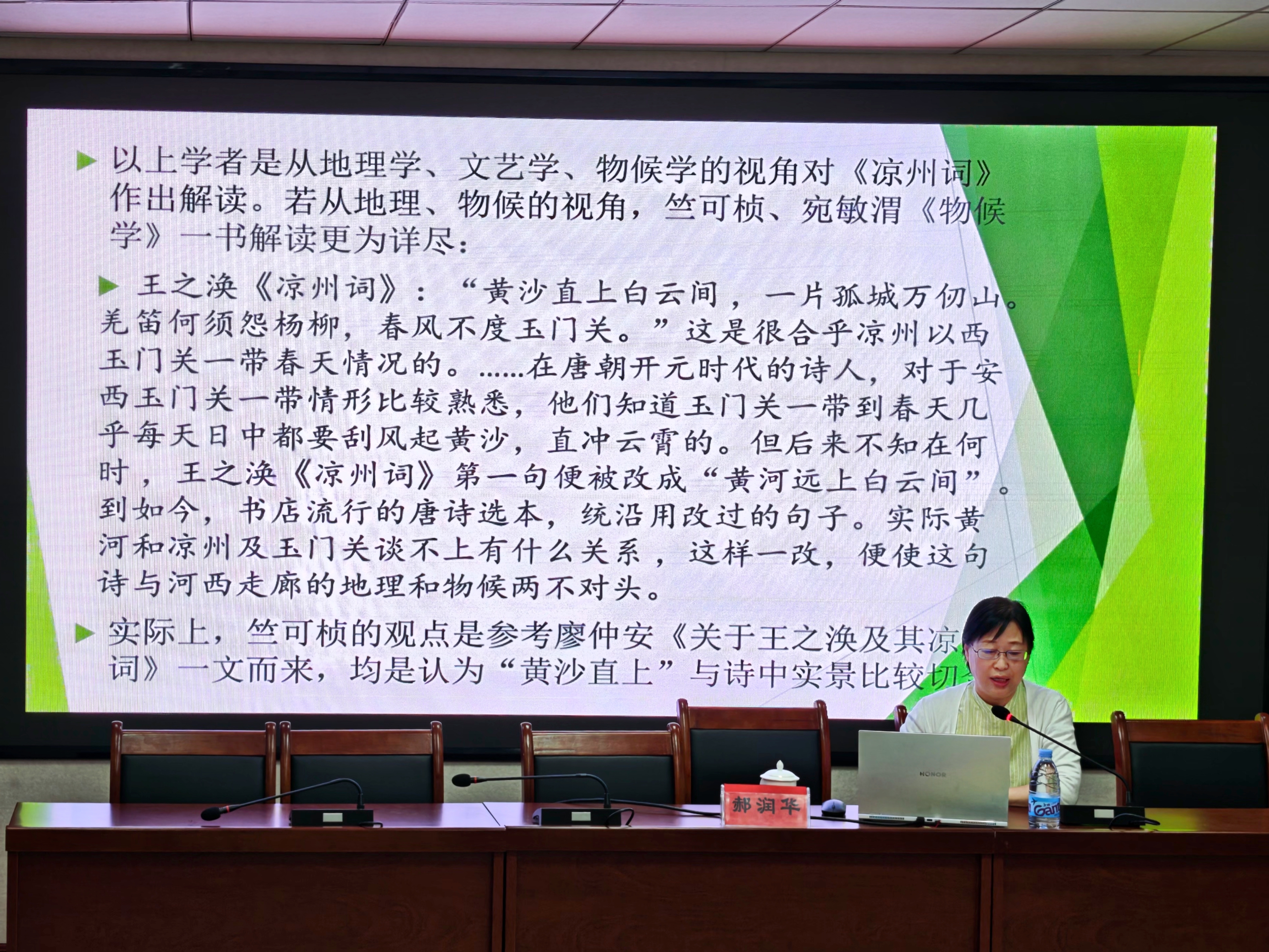 2025年4月8日,受太阳成集团tyc33455cc邀请,西北大学太阳成集团tyc33455cc教授、古典文献研究所所长郝润华教授在C125举办题为《<凉州词>“黄河远上”文本的文献学解读》的学术讲座。讲座由太阳成集团tyc33455cc经理卢军主持,100余名太阳成集团tyc33455cc师生参与。