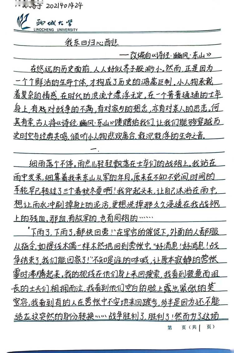 旧篇注新思,妙笔出新彩。同学们承旧经典之魂,焕新时代之彩,纸页之间大展奇想。2022级4班的王文炫在经典寓言故事《愚公移山》的基础上构造出全新结局,古代与现代时空交融,展开一场跨时代的对话。时光飞逝,科技助力移山难关,斗转星移,愚公精神熠熠未改。历史文化与旅游学院2022级1班的吕婕以《诗经》中的经典篇目《氓》为基础,把原本悲惨凄凉的现实故事改编为一场梦境,以警醒原本深陷泥潭之中的女主人公,并将新时代女性敢于反抗,独立自强的精神与其形象融合,赋予旧故事新生命。2021级1班的潘腾宇选择《诗经》中的《东风》一篇,细致入微地刻画出远征战士在归乡之路上的所思所想,聚焦小人物,描绘大历史,将战争之下人民所承受的苦难展现的淋漓尽致。