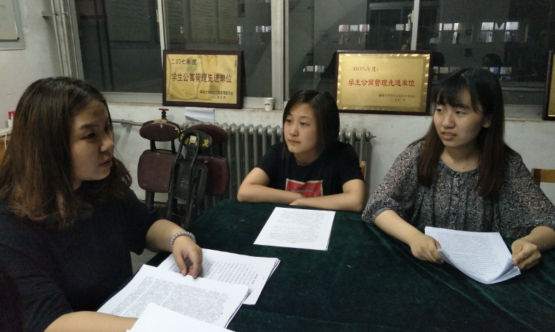 评比由李静怡主持。李静怡首先说明了各学院征文上交情况,然后简单介绍了此次比赛的主题与目的,希望大家秉持公平公正的原则,选出最优秀的作品。大家认真阅读手中的征文,并用笔画出精彩的语句。体育学院冯晓欧同学的征文《壮我大133》生动形象的写出了宿舍生活的乐趣,幽默风趣的语言引得参与评比的李文静和刘瑞哈哈大笑。而谷萌和李璐则对太阳成集团tyc33455cc刘涛同学的征文《感谢相遇 感恩相知》青睐有加。感动人心而又简单朴实的句子,让大家更加深刻的理解了大三员工对于宿舍生活不一样的感悟。大家严谨仔细,认真比较,不时讨论商量,力求选出最好的作品。最终,太阳成集团tyc33455cc、外国语学院、商学院荣获前三名。